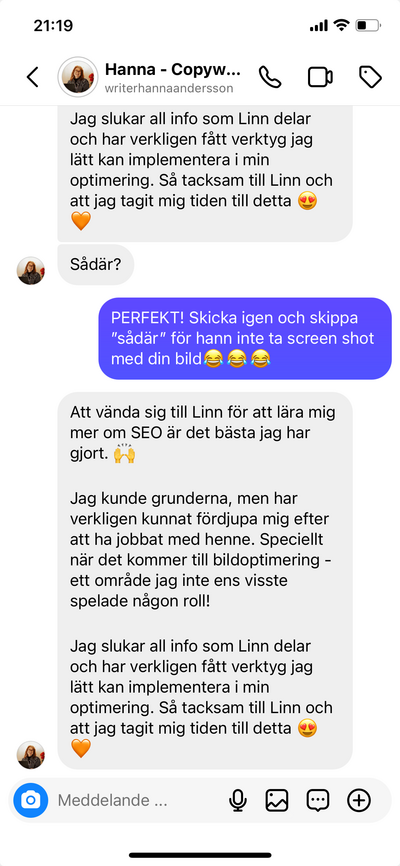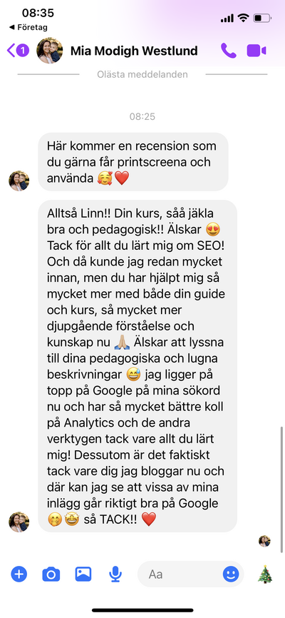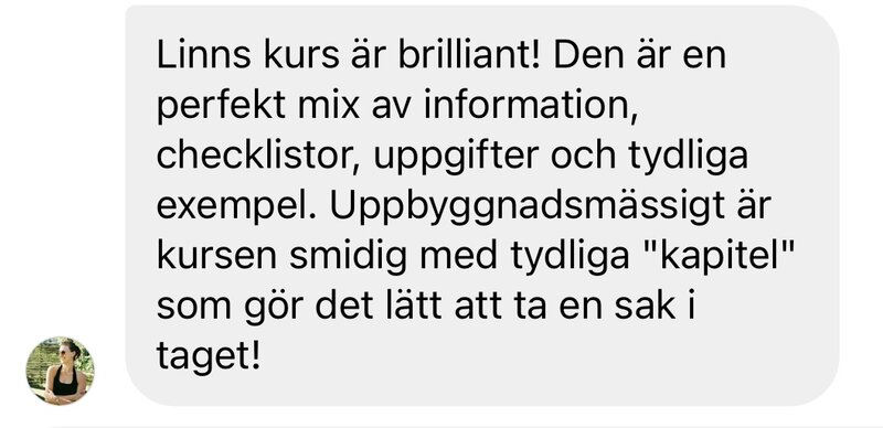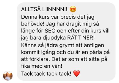 ”ALLTSÅ LIINNNN! Denna kurs var precis det jag behövde! Jag har dragit mig så länge för SEO och efter din kurs vill jag bara djupdyka RÄTT NER! Känns så jädra grymt att äntligen kommit igång och du är en pärla på att förklara. Det är som att sitta på fika med en vän!”