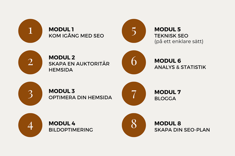 I kursen får du mina exakta strategier, som redan har hjälpt över 100 företagare, i hur du får en hemsida som syns högt på Google. Som gör att du kan släppa osäkerheten kring SEO och istället få hemsidan att dra in kunderna åt dig.